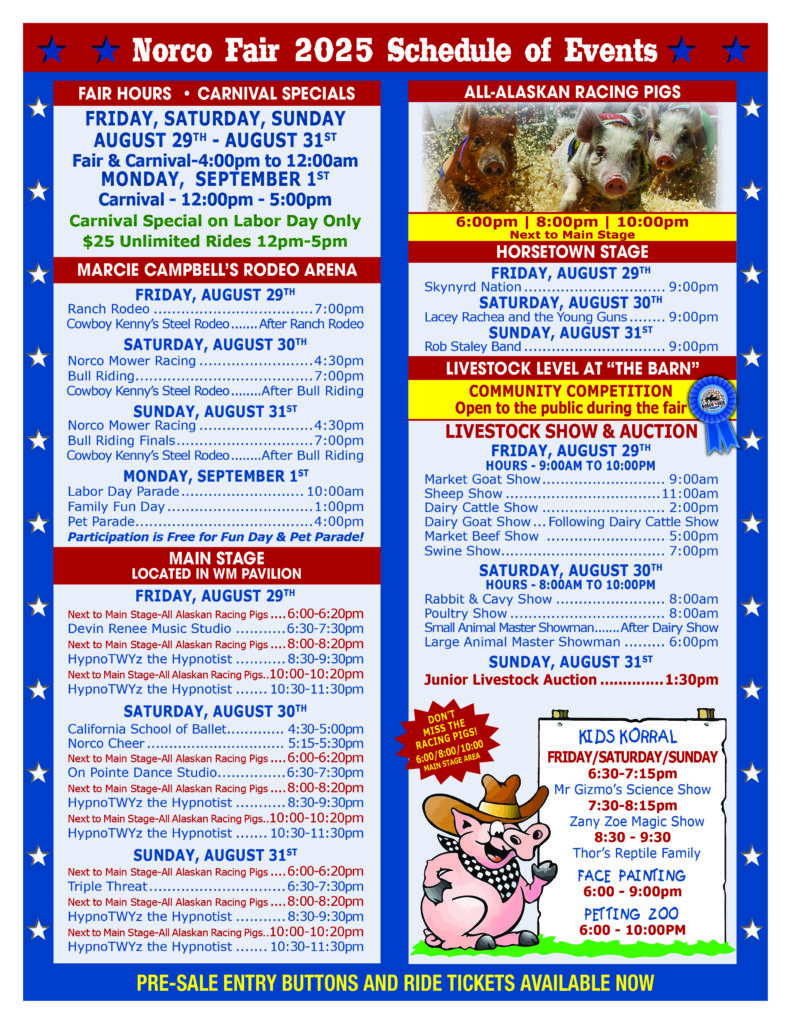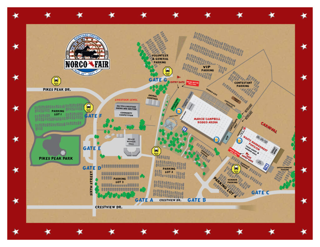 The Norco Fair has two designated parking areas: the Ingalls Event Center & an overflow lot at 6th & California.